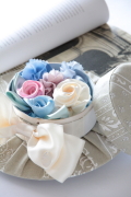 帽子の箱のふたを開けると、優しく繊細なニュアンスカラーーのお花が広がります...