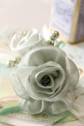 ライトグリーンを使いオリジナルのフォーマルコサージュをデザインしました。(写真↓)